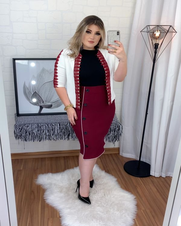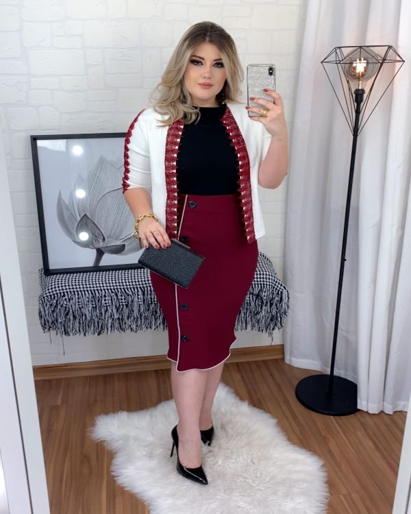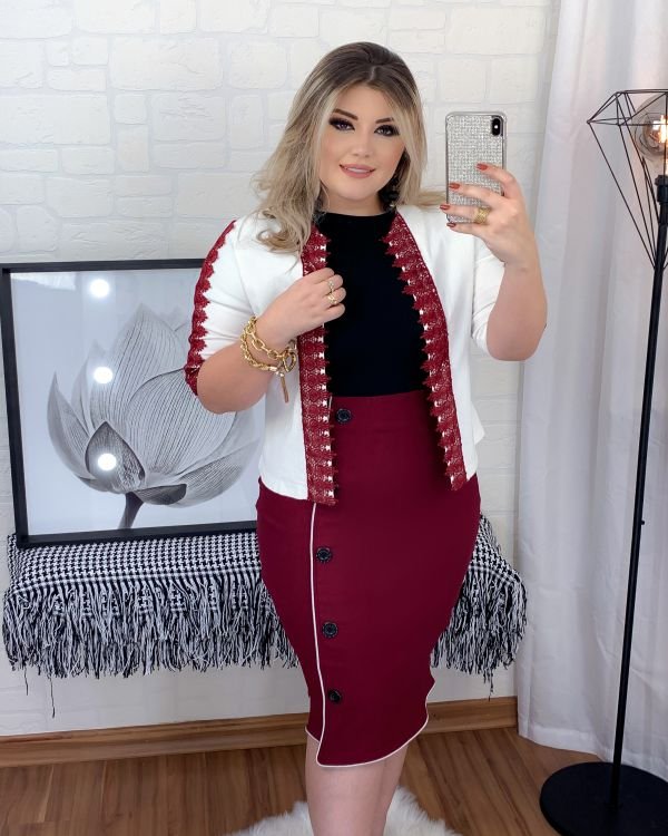 Conjunto Elegância Saia Jacaré Vinho Blazer Branco