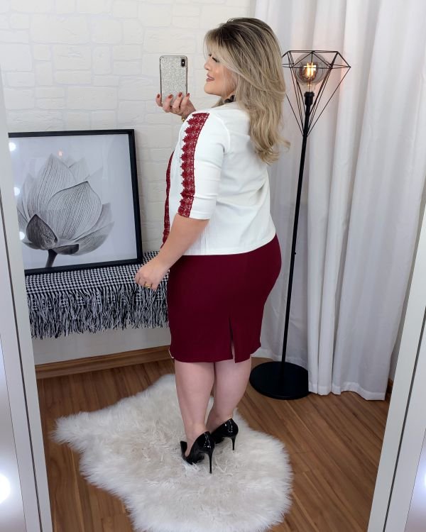 Seja o primeiro a avaliar “Conjunto Elegância Saia Jacaré Vinho Blazer Branco”